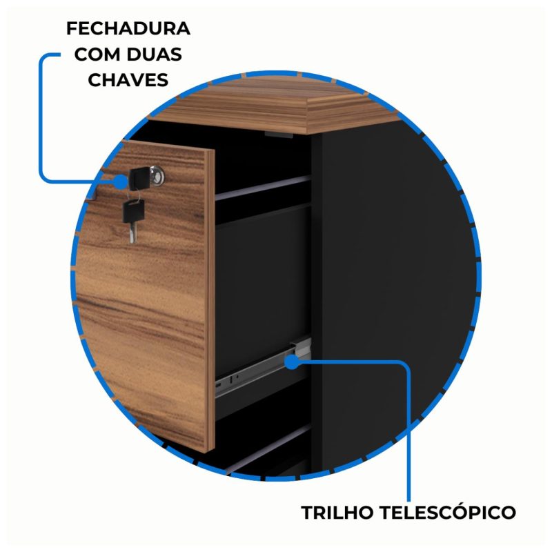 Outros Recursos / Mais informações: Sapatas Niveladoras de Altura / Trilhos para Pasta suspensa / Tranca com 02 chaves