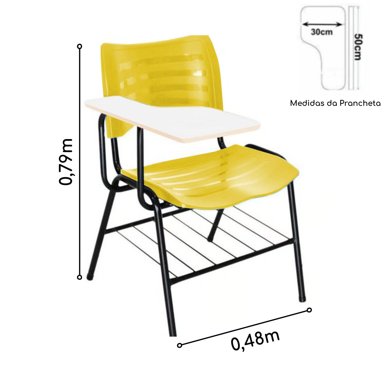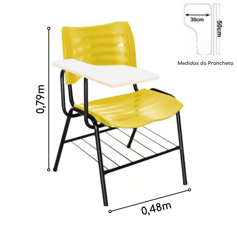 Mais informações: Prancheta em madeira, Assento e encosto em polipropileno, Base de aço com pintura eletrostática (montável), Porta Livros.