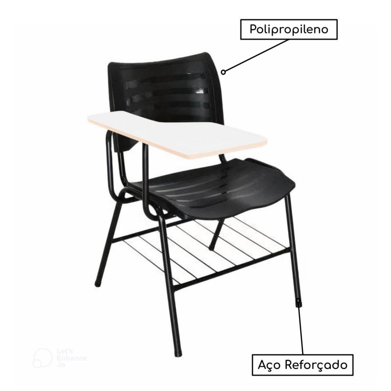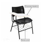 Mais informações: Prancheta em madeira, Assento e encosto em polipropileno, Base de aço com pintura eletrostática (montável), Porta Livros.