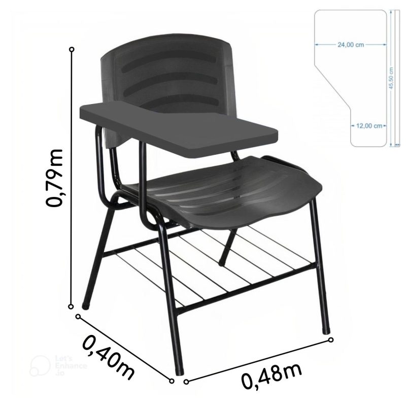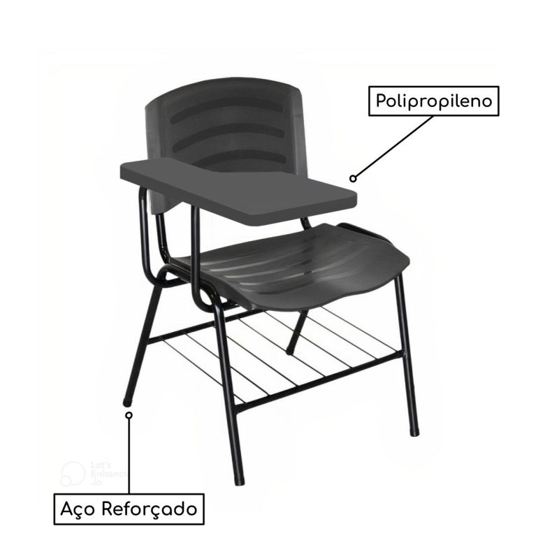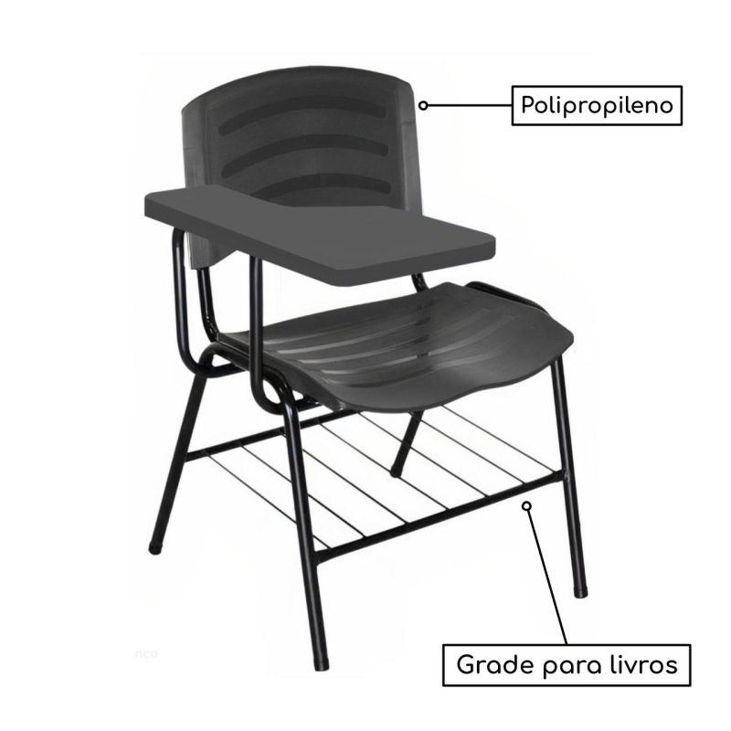 Mais informações: Prancheta em Polipropileno, Assento e encosto em polipropileno, Base de aço com pintura eletrostática (montável), Porta Livros.