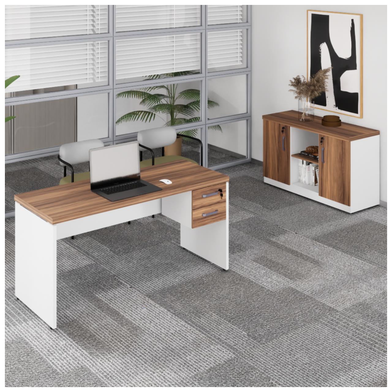 Mesa Escritório 1,20×0,60m c/ Gavetas + Armário Baixo Credenza – WORKSTART – NOGAL SEVILHA/BRANCO – 34333